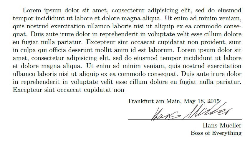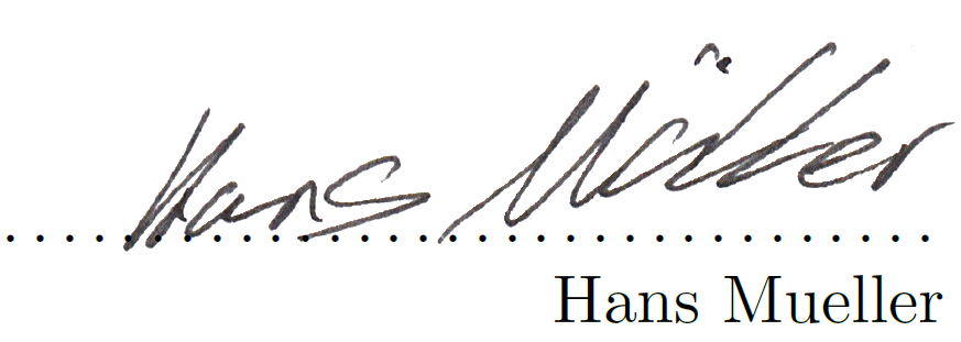 As classical post correspondence dies out, letters and contracts are usually sent over the internet. However, most official documents still have to be signed in some way. Because, printing-signing-scanning is an annoying thing to do, I am going to show you how to easily implement a professional looking signature in to your LaTex documents. On top of this, we gonna learn a lot about LaTex packages and option parsing. So, let the fun begin!
